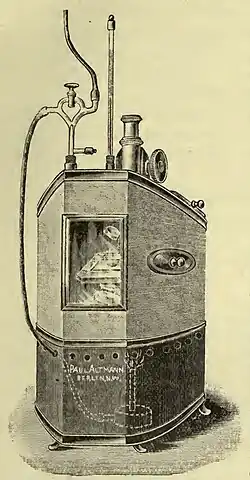 From 1892 to 1899 Nuttall was in Germany once more, first in Göttingen, then in Berlin, where he worked at the Hygienic Institute (hygienischen Institut). In 1893 He published Hygienic Measures in Relation to Infectious Diseases, a book dealing with cleanliness, disinfection and fumigation in medical practice.[9] He married Paula von Oertzen-Kittendorf in 1895. Working with Hans Thierfelder he developed methods for rearing guinea pigs under aseptic conditions, with no gut bacteria.[10] This work laid the foundation for the field of Gnotobiosis, the study of organisms with known micro-organism populations.[11][12] In 1895 he designed a microscopic thermostat for maintaining biological materials under study at a constant temperature. This was used for many years.[1][8] During this period his interest in the role of insects in transmission of disease developed, which would continue to be a major topic of research.[1]
