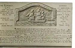 He is remembered especially for HMS Elephant which became, by chance, Nelson's flagship at the Battle of Copenhagen when Nelson transferred his flag from the 98-gun HMS St George as Elephant's shallower draught made her more suitable for the shallow waters around Copenhagen. It was therefore on the deck of Elephant that the legend of Nelson putting the telescope to his blind eye arose. The postcard of the monument to George Parsons in St Leonard's, Bursledon dates from around 1930 and is believed to have been annotated by his great-great-grandson John Denham Parsons who was a regular visitor to the village and local historian before the II World War. He gives Elephant's dimensions as Gun Deck 168 ft, Length of Keel 139 ft 10in, breadth 47 ft, depth 19 ft 9in and tonnage 1617. Gunnery is given as 28 guns of 3+1⁄2 tons each of 6-inch bore on the lower deck, 28 guns of 5 bore on the main deck and 18 9 pounders with a 4 bore on the poop with carronades as well. Two thousand oak trees are said to have been used in the construction. The full complement was 600 officers and men.