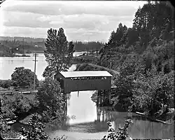 By 1911 the truss bridge was covered with a roof and walls for protection from the elements and remained in use until the concrete Pacific Highway Bridge of 1920 was completed. "Charcoal haulers would cross the covered bridge and follow the trail along the river..."(Mary Goodall, Oregon's Iron Dream). Thereafter, the covered bridge was used by those on foot until it rotted and collapsed in the 1930s. Following World War II a replacement was built and used until 1975 when it became unstable and was removed by the National Guard.[10]