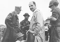As director, McGovern urged the greater use of food to enable foreign economic development, saying, "We should thank God that we have a food abundance and use the over-supply among the underprivileged at home and abroad."[3] He found space for the program in the Executive Office Building rather than be subservient to either the State Department or Department of Agriculture.[112] McGovern worked with deputy director James W. Symington and Kennedy advisor Arthur M. Schlesinger Jr. in visiting South America to discuss surplus grain distribution, and attended meetings of the United Nations Food and Agriculture Organization.[90] In June 1961, McGovern became seriously ill with hepatitis, contracted from an infected White House dispensary needle used to give him inoculations for his South American trip; he was hospitalized and unable to come to his office for two months;[113] his campaign disguised the condition by saying it was a mild kidney infection.[114]