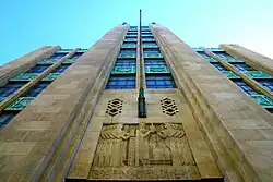 The stylized relief above the Art Deco landmark Bullocks Wilshire entrance at 3050 Wilshire Boulevard was designed by George Stanley.[15]