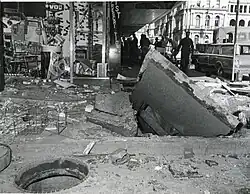 On Friday 17 July 1970, a faulty fuse in a traffic light created a spark that ignited a leaking gas pipe running through the basements of several George Street buildings (between Queen Street and Adelaide Street) which caused a series of explosions, killing one woman and injuring 38 other people. The damage to buildings in George Street and neighbouring streets as well as roads and other infrastructure was estimated at $500,000.[9][10][11][12]