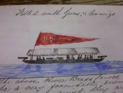 He recorded his interactions in a handwritten diary, including coloured illustrations of aspects of contemporary West African life along the river, such as this drawing of a brass canoe fitted with an awning and armed with cannons, used for local trade along the river.[4]