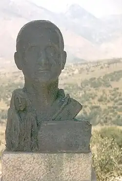 On his monument is a bust of his head sculpted by his friend Michael Tombros. On his shoulder, a woman representing Mani is weeping, mourning his death. His daughter Elyana said, "My father never wanted a monument because he was a very humble person, and he never believed in monuments; my mother insisted that he deserved one though."