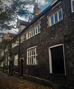 On leaving school, George Vincent, John Berney Crome and James Stark were apprenticed to John Crome, perhaps as early as 1812. Vincent's first exhibited works, two of which were described as "after Crome", were shown at Sir Benjamin Wrench's Court in 1811 and 1812.[30][31] The three friends, of whom Vincent was the most talented,[19] travelled together on sketching and painting trips, influencing each other's artistic styles in the process.[32] In January 1816 Vincent travelled to France and the Netherlands with John Berney Crome and Benjamin Steel, a surgeon who was to marry John Berney's sister Hannah six years later.[33] In a letter written by John Crome, Vincent was reported to be seasick during the crossing to France.[34] Rouen, now in the Norfolk Museums Collections,[22][35] is the only painting produced from this visit.[36] It was followed by a tour of Essex, during which time he painted works depicting the villages of Ingatestone and Little Baddow, and in 1816 he and Stark exhibited views of Windsor after touring the area.[26] In around 1818 he left his family home on St. Clement's Church Alley and moved to London, residing first at 7 Wells Street,[24][31] and then at 86 Newman Street, next door to Stark. Nearly every house on Newman Street was occupied by working artists; according to the Survey of London: South-East Marylebone, "by the time a Newman Street address had become a step on the road to fame, the really famous had moved out". Vincent lived there until 1821.[26][37]