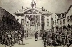 Leonard was also one of the founders of Wall Street, being a founder of the New York Stock Exchange through the Buttonwood Agreement, and was a brother of Anthony Lispenard Bleecker.[10][11][5] Their uncle Col. Leonard Lispenard married with Benjamin Franklin's family (Bache), the Roosevelts and Van Cortlandts. Bleecker entered into a partnership in 1791 with merchant John Pintard, a founder of the New York Historical Society, the first museum in the city, and had office at the Merchants’ Coffee House in Manhattan, which was also the offices of the Bank of New York, founded by Hamilton, and the New York Chamber of Commerce.[12][13] His granddaughter, Fannie Amelia Bleecker, married Frank Willey Yale (b. 1854), a relative of Charles G. Yale and Yale Gracey, members of the Yale family of Yale University.[14]