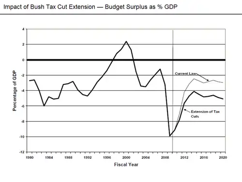 - The CBO estimated in January 2009 that extending the Bush tax cuts at all income levels over the 2011–2019 period would increase the annual deficit by an average of 1.7% GDP, reaching 2.0% GDP in 2018 and 2019.[3]