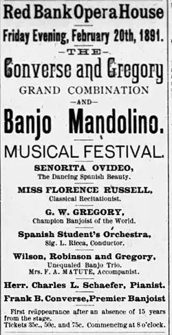 In February 1891, labeling himself the "Champion Banjoist of the World", Gregory teamed up with Converse in Red Bank, New Jersey to form the Converse and Gregory Grand Combination.[7] The combination featured the banjo players, a former member of Carlo Curti's Spanish Students, Sig. Luigi Ricca (leading his own Spanish Student group), the Spanish dancer Signora Ovideo, and classical recitationist Florence Russell.[7]