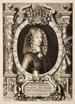 George William (German: Georg Wilhelm; 26 January 1624 – 28 August 1705) was the first Welf Duke of Lauenburg after its occupation in 1689. From 1648 to 1665, he was the ruler of the Principality of Calenberg as an appanage from his eldest brother, Christian Louis, Prince of Luneburg. When he inherited Luneburg on the latter's death in 1665, he gave Calenberg to his younger brother, John Frederick.