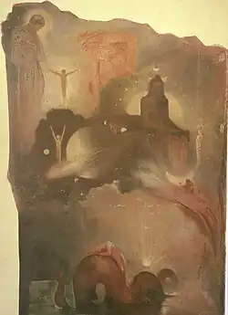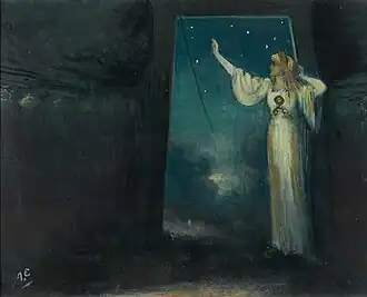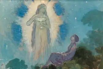 He claimed to see nature spirits and made paintings about them, such as the sídhe, elven or faerie beings in Irish folklore.[19][20] On one occasion, he showed some drawings he had made of them to a peasant, who would have pointed out that he had already seen many of those entities.[20] In 1889 he had traveled with W. B. Yeats to a town in County Galway, where Russell also painted these spirit beings, and a Druid is said to have appeared to them in vision.[21] The previous year, in a letter to Yeats, Russell had stated: