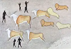 Stow was a competent water-colour painter and 74 of his paintings were reproduced in "Rock Paintings in South Africa from Parts of the Eastern Province and Orange Free State" with an introduction and notes by the noted anthropologist Dorothea F. Bleek, daughter of renowned German linguist Dr Wilhelm Heinrich Immanuel Bleek. In 1944 she donated to the McGregor Museum a number of watercolours and rubbings of rock engravings in her possession and produced by Stow when on the Diamond Fields in the 1870s.[2] In a letter dated June 1877 to Dorothea Bleek's aunt, Lucy Lloyd, Stow confided his plan to continue documenting rock art with the help of his young Bushman assistant. Despite a lack of funding, Stow persisted in recording rock art for posterity.