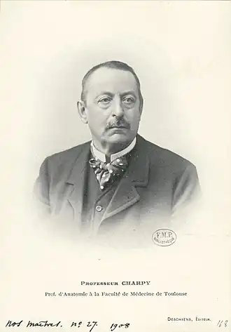 Augustin Georges Albert Charpy (1 September 1865 – 25 November 1945) was the French scientist who created the Charpy impact test. He attended École Polytechnique from 1885 to 1887 and graduated with a degree in Marine Artillery. In 1887 he became a professor at École Monge. In 1892 he published his physics thesis. In 1920 he became a professor of metallurgy at École Nationale Supérieure des Mines de Paris. In 1922 he became the professor of general chemistry at École Polytechnique. He died of a heart attack in Paris, France.