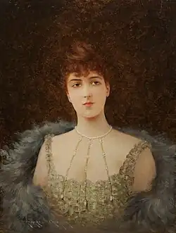 Most of Croegaert’s portraits of elegant young women are distinguished by their lavish detail. The influence of his relation, Jan Jacob Croegaert-Van Bree, is suspected in the elegance and realism of his style.[3] When he arrived in Paris portrait paintings depicting the lifestyle of contemporary, fashionable city dwellers had become popular. The trend was started in Paris in the late 1850s by the Belgian painter Alfred Stevens and was then adopted by other Belgian painters working in Paris such as Charles Baugniet and Gustave Léonard de Jonghe and the Frenchman Auguste Toulmouche.[5] By the late 1860s there was a ready market for genre scenes with bourgeois figures, usually young glamorous women, depicted in sumptuous surroundings.[6] With the onset of the Belle Epoque in the 1870s, this type of paintings depicting fashionable women set in an interior became popular at the Paris Salon.[5]