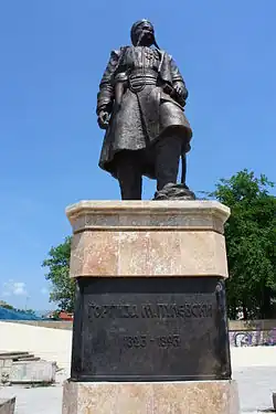 Linguist Victor Friedman regards Pulevski as a "complex and modern personality that very well understood the complexities of ethnical-national and civilian-national affiliations in the multilingual and multicultural environment of Macedonia."[29] His work Slavic Macedonian General History was published by the Macedonian Academy of Sciences and Arts in 2003. A monument of him was placed in the center of Skopje in 2011.[24] In North Macedonia, he is celebrated as a contributor in the "National Rebirth".[13] Despite Pulevski being an early adherent of Macedonism,[42][43] because of his pro-Bulgarian military activity, in Bulgaria he is regarded as a Bulgarian.[44][45][46] According to Tchavdar Marinov, of the Bulgarian Academy of Sciences,[47][48] there are reasons to interpret the case of Pulevski as a lack of clear national identity by him, while his numerous self-identifications reveal the absence of a clear national identity among the Slavic portion of the population in the region of Macedonia.[49]