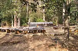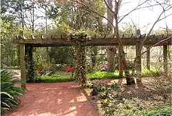 The walking woodland trails have benches scattered about so that people can sit and rest while enjoying the birds and other wildlife that live within the gardens. On one woodland trail is the Kennedy Outdoor Classroom with a small raised stage and benches that is used for some botanical garden presentations.