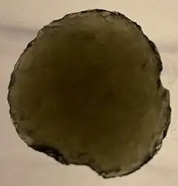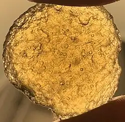 Georgiaite specimens that have been found typically have a round shape and pock marked surfaces caused from the extreme conditions of its formation. Georgiaite most commonly is translucent with an olive green color. The size of Georgiaite can vary but most samples collected average around 2 inches (51 mm) at most.[2] Georgiaite, like other tektites, are silicate glass and most closely resemble obsidian.[1][3] Unlike other North American tektites, Georgiaite contains silica and potassium while showing no traces of any other major elements.[4]