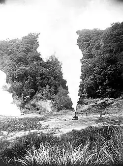 The first proposal on energy from volcanoes came in 1918 during the Dutch colonial era. In 1926, five test borings were drilled in Java's Kawah Kamojang field, the third being the first that was successful.[4] In the early 1980s, it was still discharging superheated steam from a depth of 66 metres at a temperature of 140 °C and a pressure of 3.5 to 4 bars. A prefeasibility study for electricity generation was initiated in 1972 by Geothermal Energy New Zealand.[5] The first generator was inaugurated in 1983 by President Suharto and subsequently expanded in 1987.