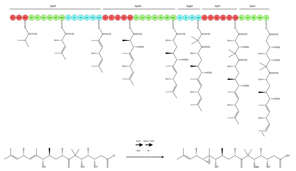 Gephyronic acid contains a methyl ether at C-5 and a C-12/C-13 epoxide. These functional groups are incorporated by post-PKS tailoring enzymes. GphA is likely responsible for installation of the C-5 methyl ether. O-methyltransferases SpiB and SpiK used in spirangien biosynthesis exhibit the same SAM-binding motif as GphA.[6]