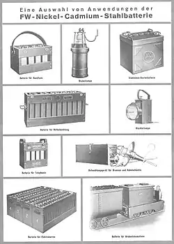 In the early 1920, cars became equipped with electric starter motors and FrieWo started producing car batteries for Horch and Audi.[7] Battery manufacturing gradually became the company's second main field of activity, as later into the decade, FrieWo began supplying Deutsche Reichsbahn with Ni-Cd and lead-acid batteries. After the Nazi Party's ascend to power, the Wehrmacht became a major customer, and air raid lamps with blackened light bulbs were added to the portfolio.