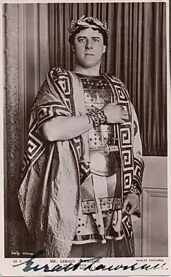 After serving in the Royal Naval Volunteer Reserve during World War I[14] he returned to the stage in 1919, playing de Guiche to the Cyrano de Bergerac of Robert Loraine in Rostand's Cyrano de Bergerac. He was Cavaradossi in Victorien Sardou's La Tosca at the Aldwych Theatre (1920);[15] directed and played David Garrick in Louis N. Parker's play Mr Garrick at the Royal Court Theatre (1922);[16] and in 1923 played the title role in a provincial tour of a revival of Booth Tarkington's Monsieur Beaucaire before opening in it in 1924 at the Strand Theatre.[17] In 1927 Lawrence, by now known primarily as a film actor, again undertook a tour of South Africa as actor-manager of a West End theatre company putting on a repertoire of plays that included Monsieur Beaucaire, The School for Scandal, David Garrick, 13, Simon Street and Beau Brummel. In 1930 he played the Duke of Buckingham in Richard III at the New Theatre and later at the Prince of Wales Theatre.[18] He made his last appearance on the stage in 1938 in Drake at the London Coliseum.[13][19]