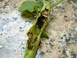 Once hatched, the larvae bore through the stem of the host plant, where they are typically found within the stem or flower buds. The plant stem usually turns black after being invaded by larvae. The larva feeds on the host plant, damaging the host until it enters the pupa stage.[4]