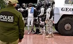 At around 6 pm, the officers of the National Police of Uruguay and the department for the Suppression of Illegal Drug Trafficking arrested González Valencia, his father-in-law, and nine other suspects. González Valencia tried to escape but was quickly apprehended.[44][45] When he was about to get arrested, he destroyed his iPhone by throwing it on the ground.[k] He was not armed at the moment of his arrest.[22] On 23 April, Amaral Arévalo was arrested by anti-narcotics agents at the Carrasco International Airport after returning from Mexico.[5] She said she had returned to Uruguay to pick up her three children and take them to Guadalajara, Mexico.[40] The children were taken to the Uruguayan Institute for Children and Adolescents by the police,[47] and were later put in custody of their aunt who came to Uruguay from Mexico with Amaral Arévalo.[22] The children later went back to Mexico.[48]