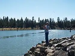 Gerber Reservoir is an irrigation impoundment created by Gerber Dam. The reservoir covers 3,815 acres (1,544 ha). It is approximately 5 miles (8.0 km) long and 2.3 miles (3.7 km) wide. The reservoir has a branching shape with shallow arms that follow various watershed drainages. There is one permanent island in the middle of the reservoir. The reservoir has an average depth of 27 feet (8.2 m) with a maximum depth of 65 feet (20 m). Its elevation is 4,835 feet (1,474 m) above sea level.[6]