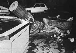 After having stood in place for 443 years, the statue was torn down after midnight on 13 October 1986 by means of a rope and tackle.[19] It was largely destroyed by the fall. The act was not claimed by anyone,[20] but was generally attributed to the Groupe Bélier, a militant youth organisation advocating Jurassic separatism.[19] At that time, the Béliers frequently engaged in acts of vandalism to express the Jurassian separatists' outrage over allegations of irregularities in the plebiscites of 1974–75 that caused the Bernese Jura to not join the canton of Jura; and over what was, according to the separatists, a cover-up of these irregularities by the Bernese and federal authorities.[19]