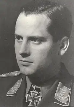 On 5 December 1941, Galland was appointed General der Jagdflieger (General of Fighters). In consequence of Galland's advance in command responsibility, Schöpfel succeeded him as Geschwaderkommodore of JG 26 on 6 December and Hauptmann Josef Priller became the new Gruppenkommandeur of III. Gruppe.[45] Three days later, he was awarded the German Cross in Gold (Deutsches Kreuz in Gold) on 9 December.[3] In December, he was also promoted to Major (major).[26]