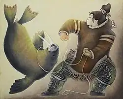 Germaine Arnaktauyok (born in Maniitsoq, Greenland in 1946)[1][2] is an Inuk printmaker, painter, and drawer originating from the Igloolik area of Nunavut, then the Northwest Territories.[1] Arnaktauyok drew at an early age with any source of paper she could find.