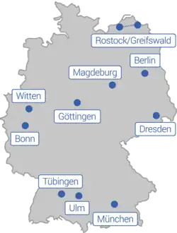 In total there are 10 sites all over Germany:[3] Berlin, Bonn, Dresden, Göttingen, Magdeburg, Munich, Rostock / Greifswald, Tübingen, Ulm and Witten.