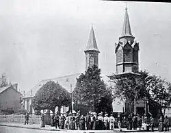 In the early 1870s, Canterbury experienced significant immigration. Between the 1871 and 1874 census, the region had 25% growth in population. By 1874, Germans made up about 6% of the foreign-born population of Canterbury.[5] The Deutsche Kirche came from an initiative of German Lutherans living in Canterbury, with German baker and hotel keeper George Ruddenklau presiding over a committee in charge of getting the church built.[6] The intention was to collect sufficient funds through subscription lists and if successful, send for a German minister and have a church constructed.[7] From early April 1872, the organising committee advertised for a central city site for cash purchase.[8] Later that month, auctioneer Herbert Edward Alport[9] reported that he had completed the sale of a quarter acre section on the corner of Worcester and Montreal Streets;[10] the land had been sold for £230.[11] In May 1872, Thomas Joynt moved in the Canterbury Provincial Council that a grant of £230 be given towards the erection of the church. Of those who spoke to the motion, Arthur Charles Knight, Walter Kennaway (as provincial secretary), John Thomas Peacock, Edward Richardson, and William Cowlishaw (provincial treasurer) supported the motion. John Inglis, Colonel De Renzie Brett, George Buckley and George Healey spoke against the motion. When put to a vote, the motion was passed by 22 votes to 14.[12] In the end, the provincial government provided £250.[11]