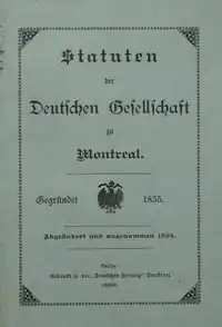 The German Society of Montreal (French: Société allemande de Montréal; German: Deutsche Gesellschaft zu Montreal) is a Montreal-based non-profit organization with the mission to promote the German language and culture in Montreal and to promote the health and welfare of Montrealers of all origins.[1] The Society was founded as an association of German-speaking business people and professionals in 1835[2] and was incorporated by the Act to incorporate the German Society of Montreal,[3] a public act of the Province of Canada in 1865. Today, the Society is an important social and cultural institution in Montreal's German and German-speaking community.