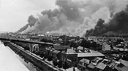 At 10:00 a.m., the aircraft dropped dozens of 55 kg (121 lb) bombs along the railroad in three places, simultaneously strafing anything that moved.[8] Two wagons, one carrying 12 t (12 long tons; 13 short tons) of artillery ammunition and another carrying high explosives (melinita and cheddite) were hit.[14][2][9] The majority of the bombs fell on the plain of Baud, an industrial area that included the marshalling yards, and Saint Hélier, where the high explosives train was parked.[14] The high explosive and the ammunition train blew out in a huge conflagration.[2] The blast of the ammunition train left a crater 80 m (260 ft) long, 20 m (66 ft) wide and 5 m (16 ft) deep. Wagons, live artillery rounds and debris fell as far as 300 m (980 ft) away.[5] The explosions continued for the next 24 hours and the fires burned for several days.[9][5] More than 22 km (14 mi) of railway were destroyed, as well as 1,000 railway cars.[15] The German report put the number of wagons destroyed at 500. They also acknowledged that one of the bombers sustained damage from flying debris.[13] Doors and windows were shattered within an extensive radius, as well as some stained glass of the Church of Saint-Germain and the roof of the friary of La Solitude.[9][16][17]
