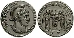 | IMP CONSTAN-TINVS MAX AVG, laureate and helmeted head facing right, with armoured bust; | VICTORIAE LAETAE PRINC PERP ("Joyful victory's eternal prince"), two Victories standing facing each other, holding a shield bearing the inscription VOT/PR on two lines on top of an altar with a *; in exergue P T ("First official of Ticinum") in esergo. |
