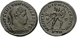 | IMP CONSTANTINVS P F AVG, laureated head looking right with armoured bust; | MARTI PATRI PROPVGNATORI (with Father Mars, the protector), Mars looking to the right and holding a lance and a shield in his hands; T F on the sides and P TR in the exergue. |