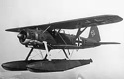Formerly a freighter named Kandelfels, she was completed by AG Weser in 1937 and was owned and operated by the Hansa Line, Bremen.[2] The ship was of gross register tonnage (7,766 GRT) was 508 ft 6 in (154.99 m) long, 61 ft 4 in (18.69 m) in the beam with a draught of 27 ft 4 in (8.33 m) and a speed of 16 kn (30 km/h; 18 mph).[2] In the winter of 1939–1940, she was requisitioned by the Kriegsmarine and converted to a warship by DeSchiMAG, Bremen. Her main armament of six 5.9-inch guns was taken from the obsolete battleship Schlesien and covered by steel shutters fitted with counterweights.[3] The secondary armament consisted of a 75 mm gun, a twin 37 mm anti-aircraft gun and two twin 20 mm anti-aircraft guns. In the holds were 300 mines and two Heinkel He 114 floatplanes.[4]