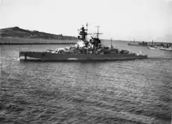 Admiral Graf Spee spent the first three months of her career conducting extensive sea trials to ready the ship for service. The ship's first commander was Kapitän zur See (KzS) Conrad Patzig; he was replaced in 1937 by KzS Walter Warzecha.[10] After joining the fleet, Admiral Graf Spee became the flagship of the German Navy.[12] In the summer of 1936, following the outbreak of the Spanish Civil War, she deployed to the Atlantic to participate in non-intervention patrols off the Republican-held coast of Spain. Between August 1936 and May 1937, the ship conducted three patrols off Spain.[13] On the return voyage from Spain, Admiral Graf Spee stopped in Great Britain to represent Germany in the Coronation Review at Spithead for King George VI on 20 May.[12]