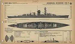 Admiral Scheer's primary armament was six 28 cm (11 in) SK C/28 guns mounted in two triple gun turrets, one forward and one aft of the superstructure. The ship carried a secondary battery of eight 15 cm (5.9 in) SK C/28 guns in single turrets grouped amidships.[3] Her heavy anti-aircraft battery consisted of three twin 8.8 cm L/78 guns. These guns were directed by three SL-4 director posts, installed on each side of the funnel and above the signal bridge. Her middle and light anti-aircraft armament consisted of four twin-mounted 3.7 cm (1.5 in) C/30 guns and ten single 2 cm (0.79 in) Flak 30 guns. During her refit in 1939-40 the 8.8 cm guns were replaced by three twin10.5 cm (4.1 in) C/33 guns, two single 2 cm were landed and two quad 2 cm were added. In 1944 her light anti-aircraft armament consisted of five quad and nine single 2 cm guns[5] By 1945, the anti-aircraft battery had again been reorganized and comprised six 4 cm guns, eight 3.7 cm guns, and thirty-three 2 cm guns.[3]