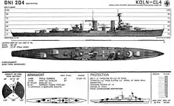 Köln was a light cruiser, the third member of the Königsberg class that was operated between 1929 and March 1945, including service in World War II. She was operated by two German navies, the Reichsmarine and the Kriegsmarine. She had two sister ships, Königsberg and Karlsruhe. Köln was built by the Reichsmarinewerft in Wilhelmshaven; she was laid down in August 1926, launched in May 1928, and commissioned into the Reichsmarine on 15 January 1930. She was armed with a main battery of nine 15 cm SK C/25 (5.9-inch) guns in three triple turrets and had a top speed of 32 knots (59 km/h; 37 mph).