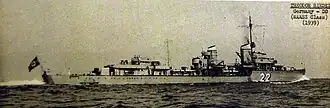 Theodor Riedel, named after Lieutenant (Korvettenkapitän) Theodor Riedel, was ordered on 9 January 1935 and laid down at DeSchiMAG, Bremen on 18 July 1935 as yard number W900. She was launched on 22 April 1936 and completed on 2 July 1937.[9] The ship participated in the late 1937 naval maneuvers and while training with the 2nd Destroyer Division (2. Zerstörer-Division) ran aground on 8 June 1938 near Heligoland island.[10] The impact badly damaged her bottom, both propellers and knocked the port turbine out of alignment. Towed to Wilhelmshaven for repairs, the dockyard was unable to fully repair the turbine's foundations and it had problems with its thrust bearings until a new turbine was fitted in 1943. Theodor Riedel participated in the August 1938 Fleet Review as part of the 2nd Destroyer Division and the following fleet exercise. The division accompanied the heavy cruiser Admiral Graf Spee on her voyage to the Mediterranean in October where they visited Vigo, Tangiers, and Ceuta before returning home.[11] The destroyer had a lengthy refit at Wilhelmshaven from February 1939 to August.[10]