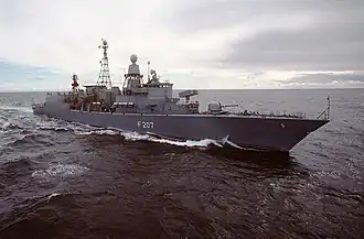 Bremen participated in various international missions during her career. She was frequently deployed to participate in NATO permanent monitoring missions in the Mediterranean during the Gulf War in 1991. In late January 1992 she escorted the German freighter Godewind into Cartagena, Spain. The Godewind had been intercepted in the Mediterranean by the destroyer Mölders while transporting T-72 tanks from Poland to Syria without German permission.[2] From 1992 to 1996 Bremen was active in the Adriatic Sea as part of NATO's Operation Sharp Guard, the maritime blockade of the former Yugoslavia during the Yugoslav Wars.[3] From 2002 she served in the counter-terrorism Operation Enduring Freedom. In 2009 Bremen joined Operation Atalanta, the EU's anti-piracy mission off the Horn of Africa. On 14 August 2009 she deployed her helicopter to counter a pirate attack on the Turkish-flagged merchant ship MS Elgiznur Cebi.[4][5] On encountering a pirate skiff and six pirates, the helicopter fired warning shots to force it to stop. The skiff was then seized by the Greek frigate Narvarinon, which found weapons and boarding ladders.[4] In May 2012 Bremen was again deployed with Operation Atalanta, taking over from the replenishment oiler Berlin, in a ceremony attended by German Secretary of State Thomas Kossendey.[6] Bremen was relieved from these duties in September 2012 by the Sachsen-class frigate Sachsen.[7]