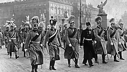 The officer corps of the Empire had neither accepted the defeat of 1918 nor its loss of its previously prestigious position as the "school of the nation".[37] It wished for the restoration of its old position and prestige. Despite foreign-imposed restrictions on armament, the Reichswehr remained a state within the state, holding considerable political leverage. Broad conservative circles but also the leadership of the Reichswehr planned a war of revenge, which was to go far beyond a simple "revision of Versailles". A "cold militarisation" was pursued by the Reichswehr already in the early 1920s, during the early period of the Weimar Republic,[38] being furthered by the authoritarian nationalism of other classes.[39] The primary goal of this were not grand violations of the provisions of the Treaty of Versailles but rather the retaining of a military routine, ultimately intending to pursue full rearmament and lead grand wars as had happened in the past.[40] Hans von Seeckt followed a policy of attempting to integrate the old Imperial army into the new, Republican state. Traditions were thus retained.[41]