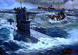 On 17 March 1941, U-99 had just fired the last of her torpedoes and sunk Korshamn when the Watch Officer spotted a destroyer, southeast of Iceland in approximate position 61°N 12°W / 61°N 12°W. He immediately ordered a dive, contrary to Kretschmer's standing orders,[7] but once the boat was under it was quickly fixed on ASDIC and attacked by HMS Walker and Vanoc. U-99 was driven deep by the attack but was nonetheless severely damaged. Kretschmer had no choice but to surface; immediately a barrage of fire greeted the boat. Kretschmer sent a message to Donald Macintyre, Walker's captain, "CAPTAIN TO CAPTAIN. I AM SUNKING [sic] PLEASE RESCUE MY CREW."[8] He then ordered that the boat should be scuttled. Forty crew, including Kretschmer, were rescued to become POWs. Three crewmen – the engineering-officer and two ratings – lost their lives.[9] The engineering officer re-entered the sinking U-boat and perished while opening the galley hatch, to hasten the boat's sinking and prevent the British from boarding it.[10]