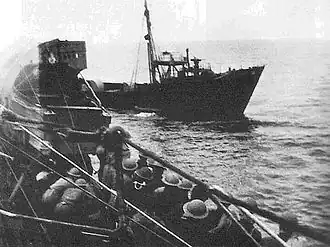 At around 7pm on 28 June, a lookout aboard Tartar sighted Lauenburg off Jan Mayen and the destroyer opened fire. Lauenburg's crew quickly abandoned the ship in two lifeboats. Minutes later, Tartar steamed alongside and a boarding party seized Lauenburg and a large amount of material was collected, then the Allied warships sank Lauenburg with gunfire; confirmation of the sinking was sent by radio, but the boarding was specifically not mentioned so that listening Germans would not suspect the recovery of Enigma materials.[2] The recovered material allowed further understanding of the Enigma codes and resulted in faster decoding of encrypted messages, as well as providing an up-to-date set of codes.