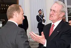 On the left, however, former Social Democrat Chancellor Gerhard Schröder announced his understanding of Russian policies and support for Putin. The New York Times editorialized that Schröder's decision to "embrace him [Putin] in a bear hug sent an unacceptable signal that some prominent Europeans are willing to ignore Mr. Putin's brutish ways."[42] According to the Russian news agency ITAR/TASS in September 2014, Russia's Prime Minister Dmitry Medvedev admitted the sanctions are hurting the Russian economy and slowing its growth. However he expected to support oil industries that are hurt, to seek financing and high technology from Asia, and to import food from new sources.[43] Germany also tried to persuade Russia to return to the Treaty on Conventional Armed Forces in Europe, which it had abrogated in March 2015.[36] Even as late as 2016, "German leaders rejected the proposal to send weapons to the Ukrainian government, as advocated by Republican congressmen in the US and treated as a possibility by Barack Obama, since pursuit of a military solution to the conflict collided with Germany’s post-war pacific security culture."[44]