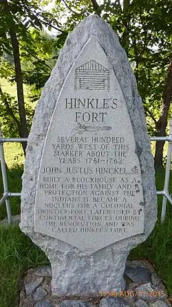 Four years later, a blockhouse (Hinkle's Fort) was built by the men of the Hinkle family to protect these border settlements from additional Indian raids. At the time of the Revolution, the fort became headquarters and training ground for the North Fork Military Company which was organized by the sons and sons-in-law of John Justus Hinkle Sr. The fort is long since gone, but a large arrowhead-shaped stone monument enclosed by an iron fence marks its former site. (This is along the valley road leading east from Riverton).