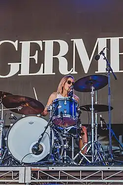 Ella Germain plays bass, electric cello, and sings backing vocals with the band. She studied and works in the media arts and communications field, including television presentation.[7]