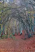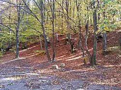 In geological terms, it has been determined that Germia mountain massif consists of layers formed during the Paleozoic, Mesozoic and the Cenozoic eras, where the flysch character limestone, silica and sand are dominant. The pedological composition mostly consists of skeletal and half-skeletal soils. Predominantly, there are maroon-colored flysch character lands, shale rocks and deep brown soil.[1] Germia mountain massif consists of hills and slopes of different heights which are separated by valleys, streams and rivers. The Vellusha river valleys, which stems in the western part of Butos' hill, is worth mentioning. The hills of Butos represent the most characteristic landscape, with over 1000 meters altitude and length of approximately 8 kilometers. This part lies between the river of Prishtina on the north and the Badovc Lake on the south.