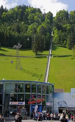 Gerschnialpbahn is a funicular railway in Obwalden, Switzerland. The line leads from Engelberg at 1000 m to Gerschnialp at 1262 m on the slopes of Titlis (3239 m). The funicular with two cars has a single track with a passing loop and a tunnel (88 m) at upper end. Journey time is 5 minutes. It operates all year.[3]